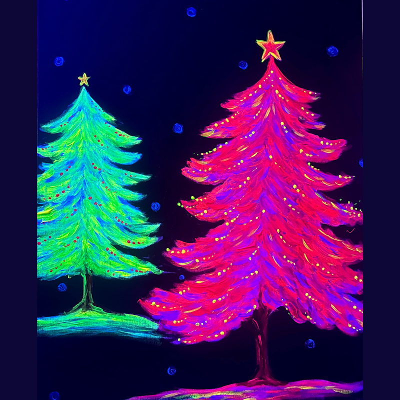 Join us for a vibrant and electrifying paint and sip experience and paint glowing Neon Trees on Canvas with neon colours under UV lights.