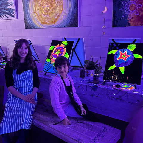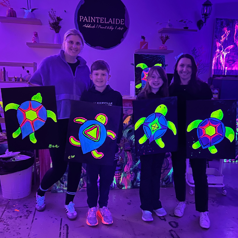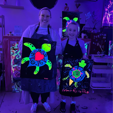 How about a family friendly limited edition Neon Lights paint and sip, where you paint along with your kids with fluoro (Fluorescent) paints under UV lights to create an intuitive Glow in the dark Neon Turtle